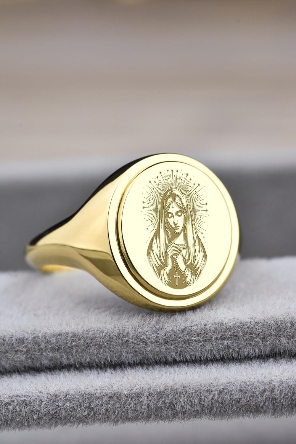 🌙 Presenting our Virgin Mary Signet Ring — where art meets timeless craftsmanship. Fashioned for connoisseurs, this oval masterpiece is handcrafted from Brass, adorned with premium Gold plating, and perfected with a sleek 3mm band that enhances comfort and style. 💖 The 15x13mm face reflects divine geometry and rich symbolism, representing confidence, balance, and self-expression. Available in sizes 5US -12.5US, this ring transitions effortlessly from daywear to celebration nights. Whether worn solo or layered, it defines sophistication, elegance, and power. 💍 Indulge in the heritage of craftsmanship and the allure of modern luxury — your story deserves nothing less.